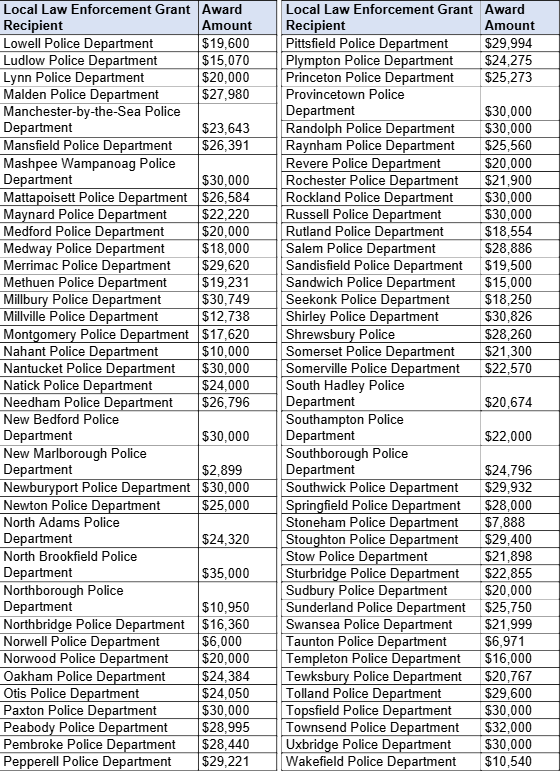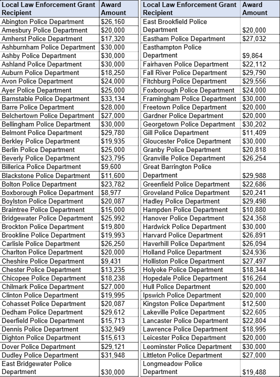 “Every community faces different challenges, from combatting opioid use to investing in at-risk youth programming,” said Lieutenant Governor Kim Driscoll. “These funds recognize that local departments benefit from having the flexibility to choose solutions that most fit their residents’ needs while promoting safer, stronger communities across Massachusetts.”