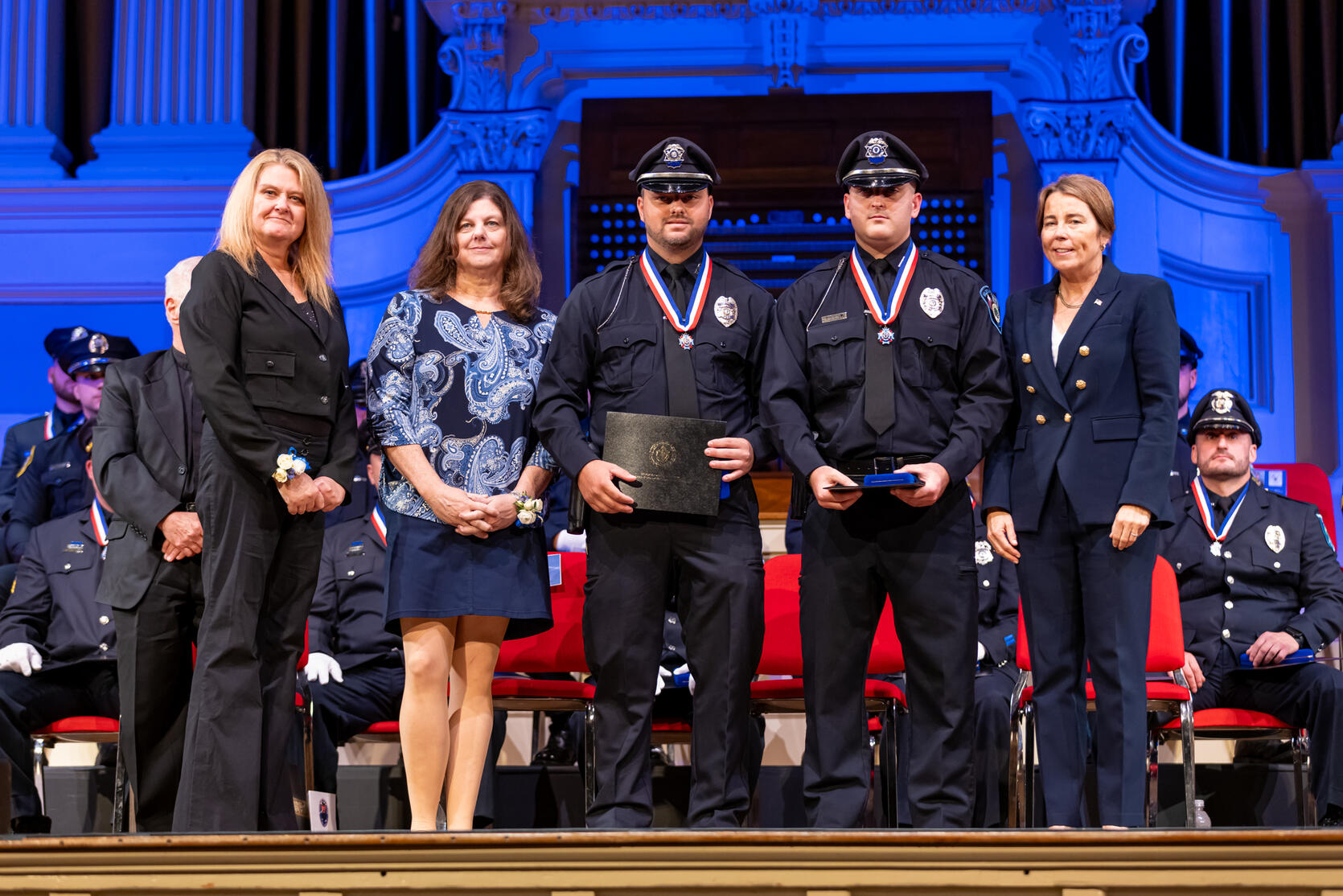 Officer Prosperi was struck twice—one round stopped by his ballistic vest, the other penetrating just below it and entering his chest cavity. Despite suffering life-threatening injuries, Officer Prosperi remained calm and returned fire as he fell to the ground. Beside him, Officer Alberici also engaged the suspect, striking him and forcing him deeper into the residence. Their decisive actions under direct fire stopped the assault and allowed fellow officers to move in and rescue the wounded Officer Prosperi from immediate danger.