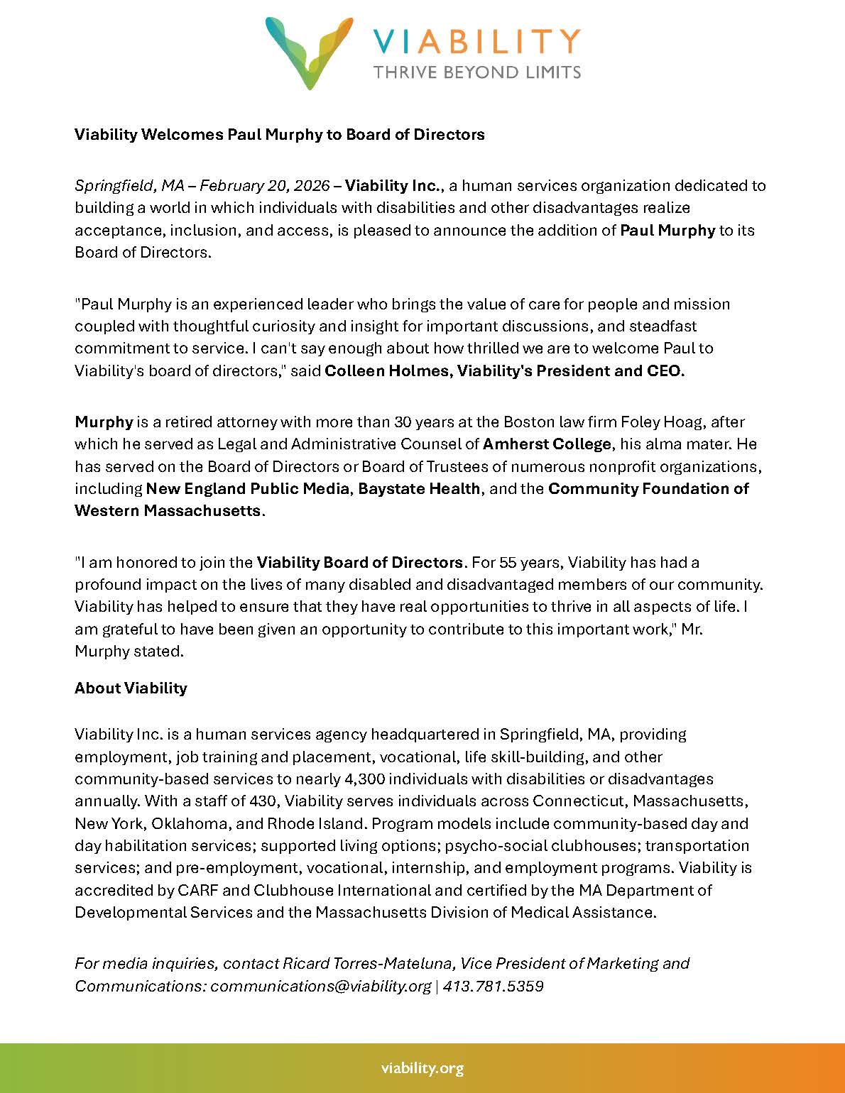 Springfield, MA – February 20, 2026 – Viability Inc., a human services organization dedicated to building a world in which individuals with disabilities and other disadvantages realize acceptance, inclusion, and access, is pleased to announce the addition of Paul Murphy to its Board of Directors.
